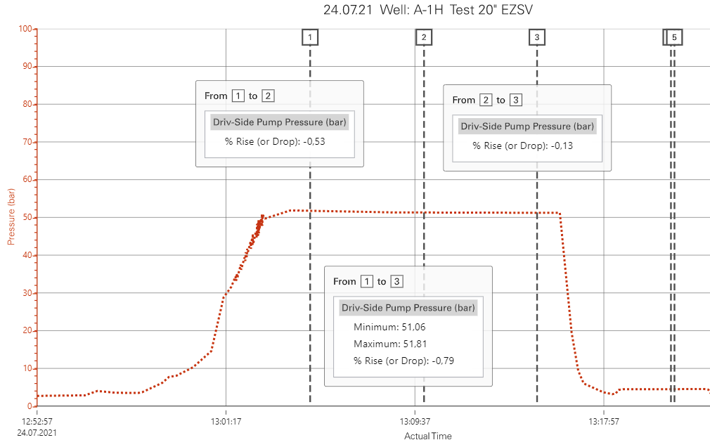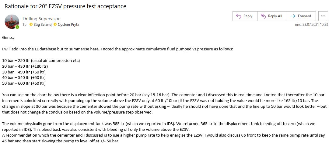 Volume required was larger that expected for first 20 bar. However from 20 bar to 50 bar the volume required was consistent with the volume above the EZSV only. The bleed off volume was also consistent with bleeding down from above the EZSV only.