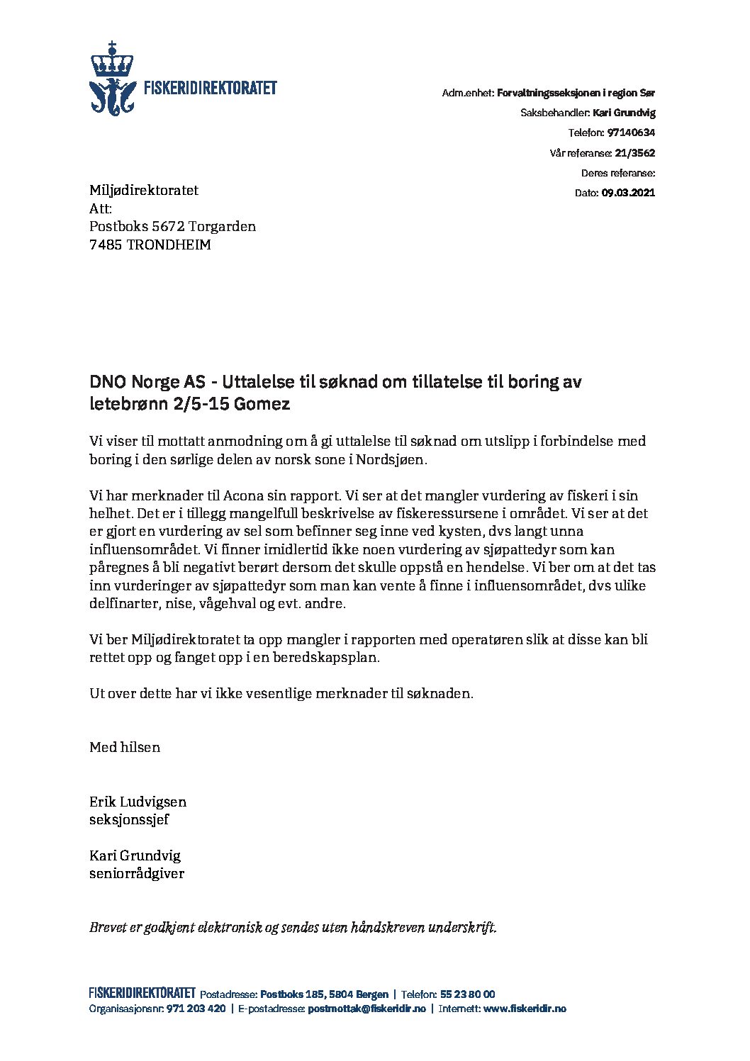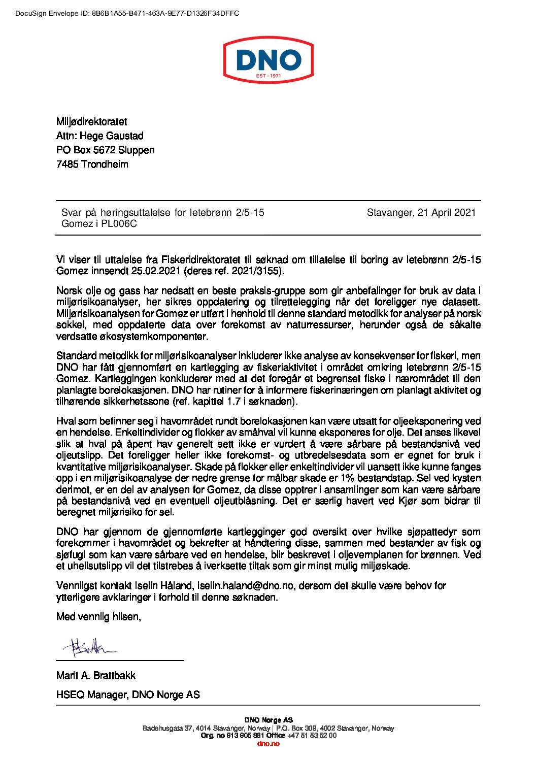 Letter sent to NEA 22.04.2021. Summary of letter: Standard method for environmental risks does not include analysis of fisheries anymore. DNO has carried out an assessment of of fishing activity as a separate report. Conclusion: Limited fishing activity near Gomez.