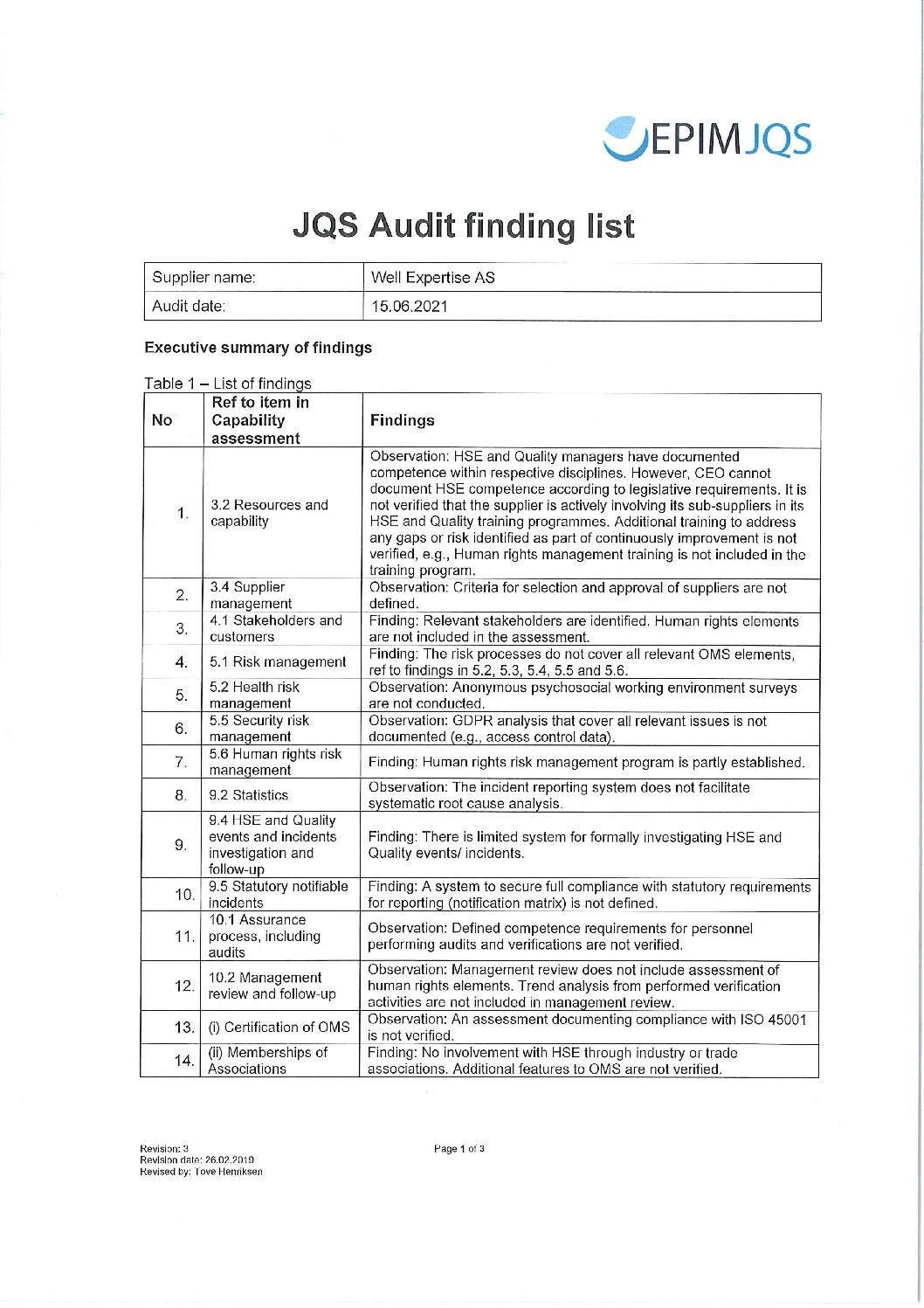competence within respective disciplines. However, CEO cannot document HSE competence according to legislative requirements. It is not verified that the supplier is actively involving its sub-suppliers in its HSE and Quality training programmes. Additional training to address any gaps or risk identified as part of continuously improvement is not