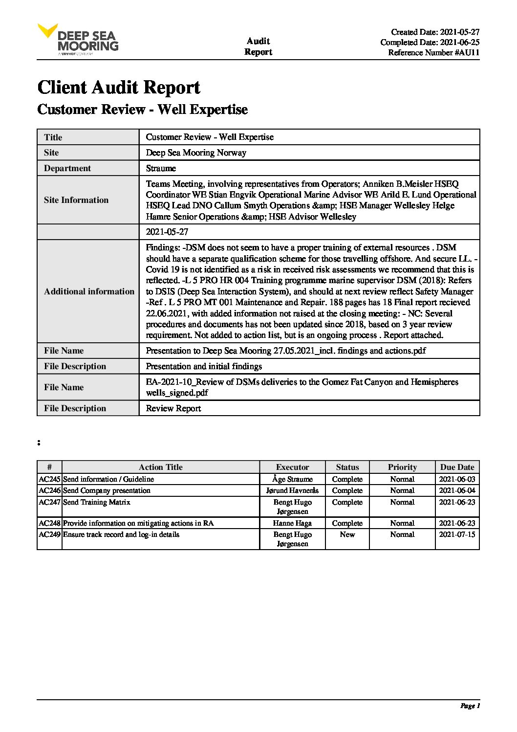 The review team’s overall impression is that DSM’s pool of equipment and inspection routines will strengthen the planned operations. The NC, improvement suggestions and observations made are considered non-critical for theoperations, but an increased focus training of external personnelis encouraged.